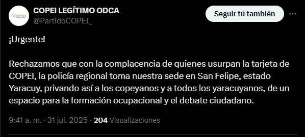 «Rechazamos que con la complacencia de quienes usurpan la tarjeta de Copei, la policía regional toma nuestra sede en San Felipe, estado Yaracuy, privando así a los copeyanos y a todos los yaracuyanos de un espacio para la formación ocupacional y el debate ciudadano», manifestó en su cuenta de X.