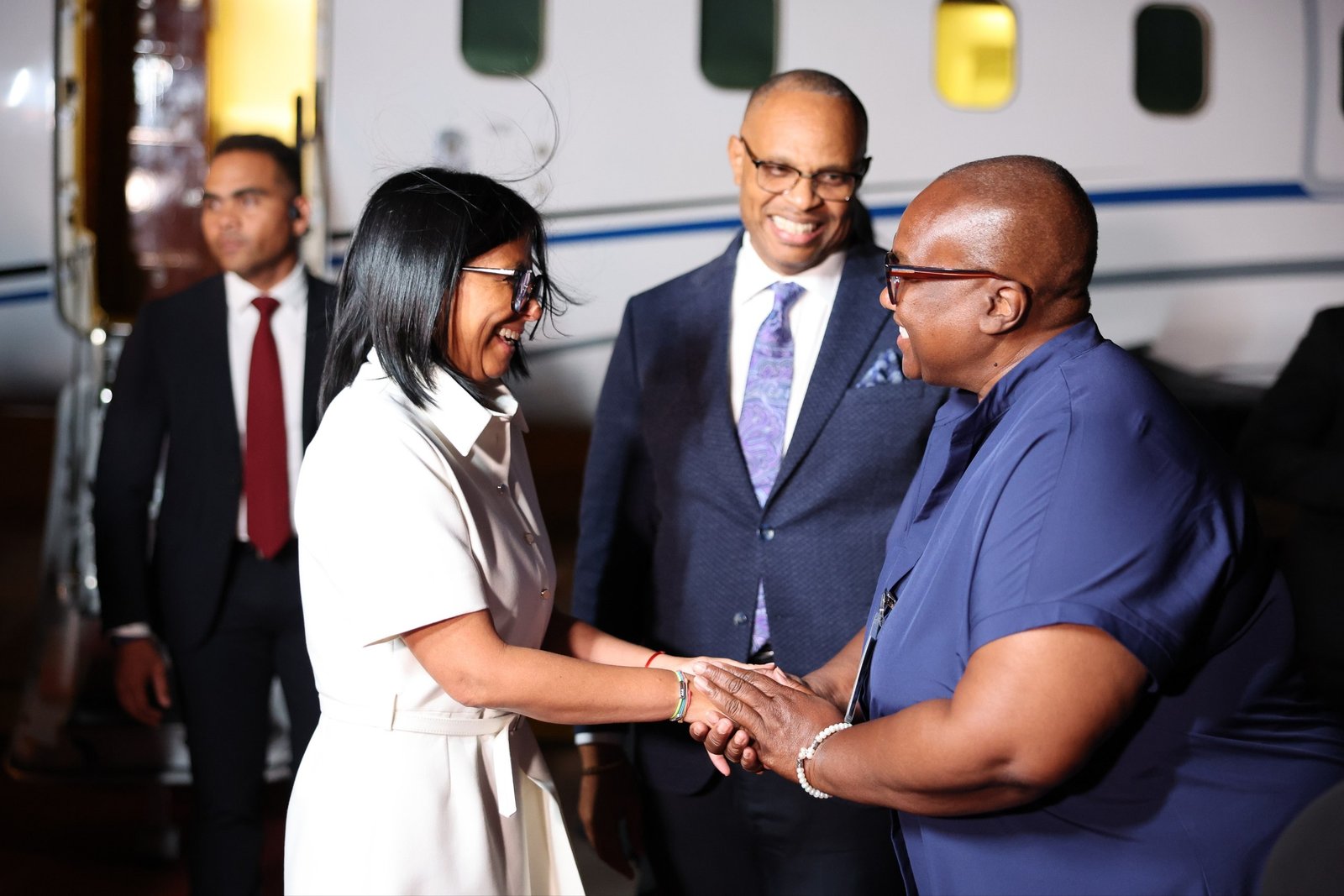 Rodríguez viajó acompañada del ministro de Comunicación e Información, Miguel Ángel Pérez Pirela; el ministro de Despacho de la Presidencia, Juan Escalona; y el viceministro de Exteriores para el Caribe, Raúl LiCausi.