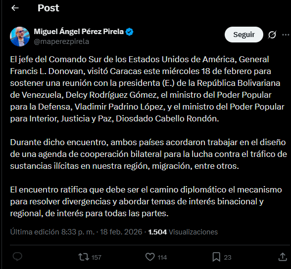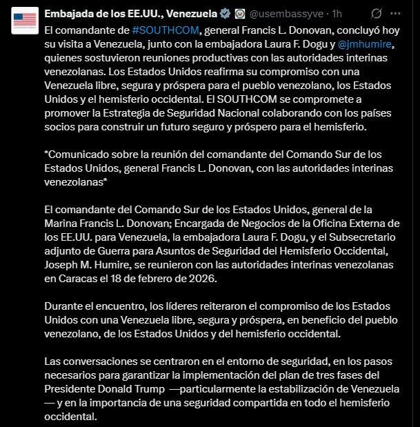 Donovan llegó a la capital venezolana este miércoles 18 de febrero para sostener reuniones centradas oficialmente en temas de seguridad, estabilidad regional y la implementación del plan estratégico de tres fases impulsado por la administración del presidente Donald Trump, que contempla estabilización, recuperación y transición en el país, luego de que Nicolás Maduro terminara arrestado en la «Operación Resolución Absoluta» ejecutada la madrugada del 3 de enero.