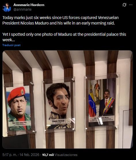 «Hoy se cumplen solo seis semanas desde que las fuerzas estadounidenses capturaron al presidente venezolano Nicolás Maduro y a su esposa en una redada matutina», comentó la periodista para dar contexto, antes de lanzar el dardo. «Sin embargo, solo vi una foto de Maduro en el palacio presidencial esta semana».