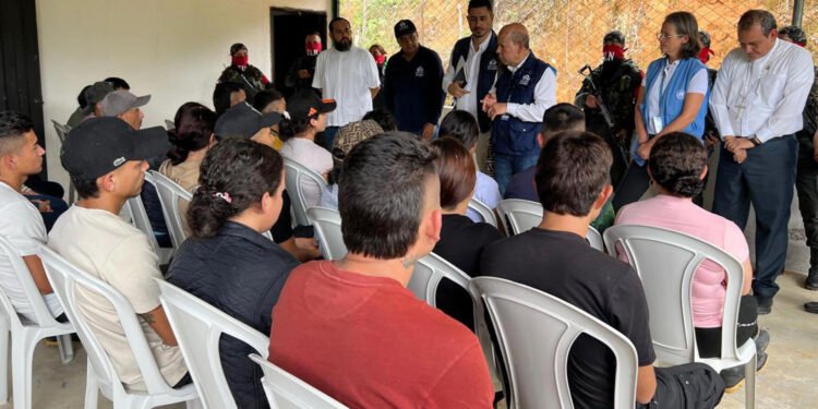 AME5423. CATATUMBO (COLOMBIA), 03/12/2025.- Fotografía cedida por la Defensoría del Pueblo de Colombia que muestra a algunos de sus integrantes durante una reunión con personas liberadas por la guerrilla del Ejército de Liberación Nacional (ELN) este miércoles, en la zona rural del Catatumbo (Colombia). Un grupo de 28 personas secuestradas a comienzos de año por la guerrilla del ELN en la región del Catatumbo, fronteriza con Venezuela, fueron dejadas en libertad. EFE/ Defensoría del Pueblo