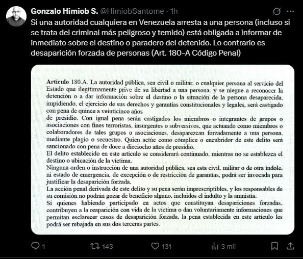 En un mensaje publicado en su cuenta oficial de X (antes Twitter), Himiob subrayó que negar información sobre el destino de una persona arrestada constituye una desaparición forzada, delito penado por la ley venezolana.