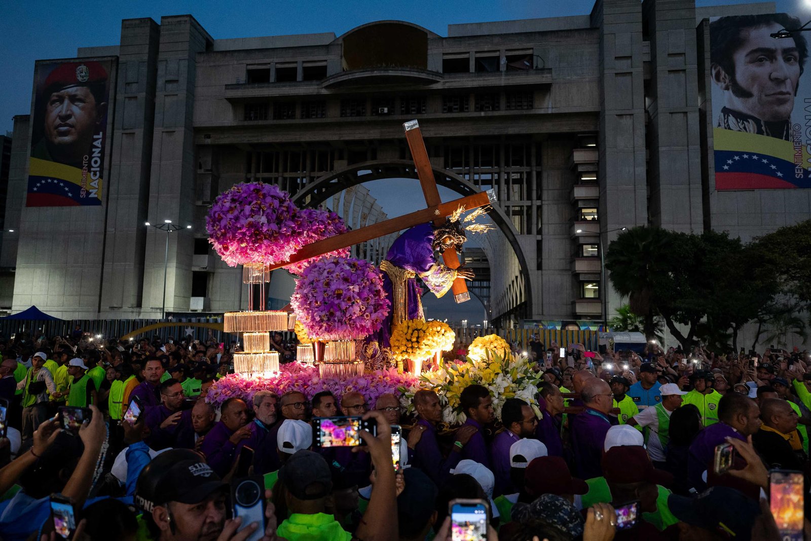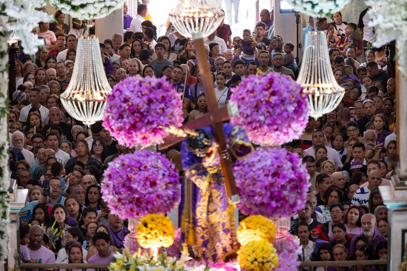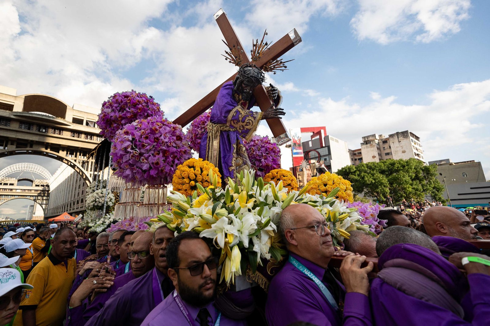 La imagen fue trasladada en un recorrido por distintas zonas de la capital venezolana, mientras los fieles acompañaban su paso vistiendo ropa y prendas moradas, color que simboliza la penitencia y la preparación espiritual.