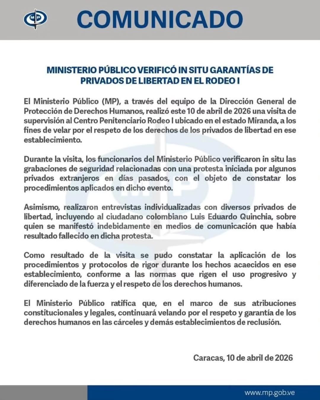 Entre ellos, se mencionó el caso del ciudadano colombiano Luis Eduardo Quinchía, sobre quien —según el MP— se difundieron versiones en medios de comunicación que aseguraban su fallecimiento, información que fue desmentida tras el contacto directo con el recluso.