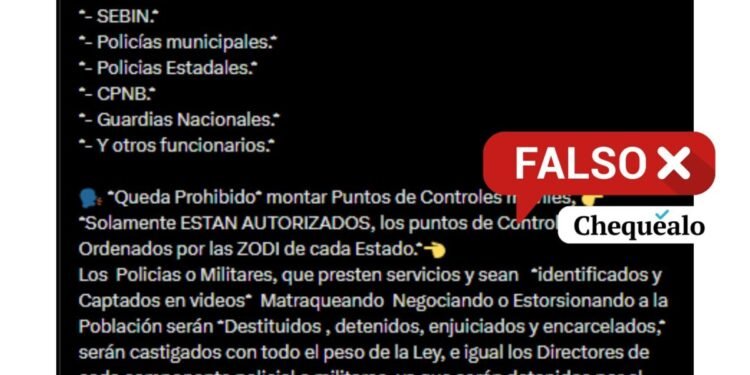 Es falso. En redes sociales y aplicaciones de mensajería instantánea ha circulado la información de que el ministro de Interior Justicia y Paz, Diosdado Cabello, informó sobre la prohibición de los puntos de control móviles o alcabalas en Venezuela. Sin embargo, no existe ningún anuncio oficial al respecto.